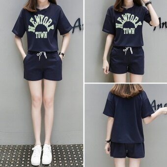 Best Buy Fat mm white small fresh casual two piece suit Female SummerStudents cotton Loose and plus-sized short-sleeved shorts sportsclothing (Black blue 501) in Malaysia